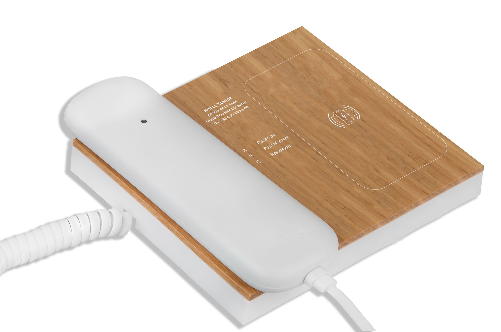 Notre téléphone de chambre avec chargeur par induction intégré est le premier du genre. Entièrement personnalisable pour s'intégrer parfaitement à la décoration des chambres (finitions disponibles : bois, cuir, Plexiglas, ardoise.....).